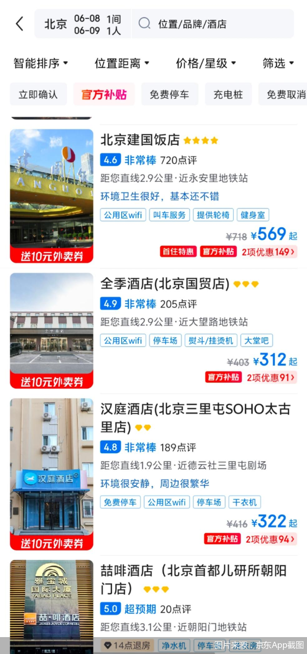 在酒店预订方面,北京商报记者看到,京东App上的很多酒店都显示有官方补贴,在抵扣官方补贴和优惠券后,比部分OTA的同酒店房型更便宜。